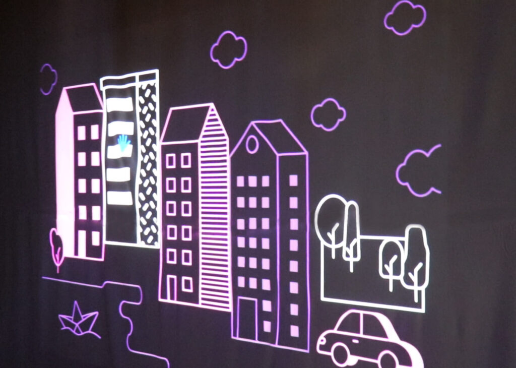 Theos es nuestra primera mesa interactiva. En ella invitamos a los usuarios a jugar moviendo sobre la mesa objetos físicos, los cuales crean nuevos elementos o situaciones en la escena ayudando o obstruyendo la meta de sus personajes.